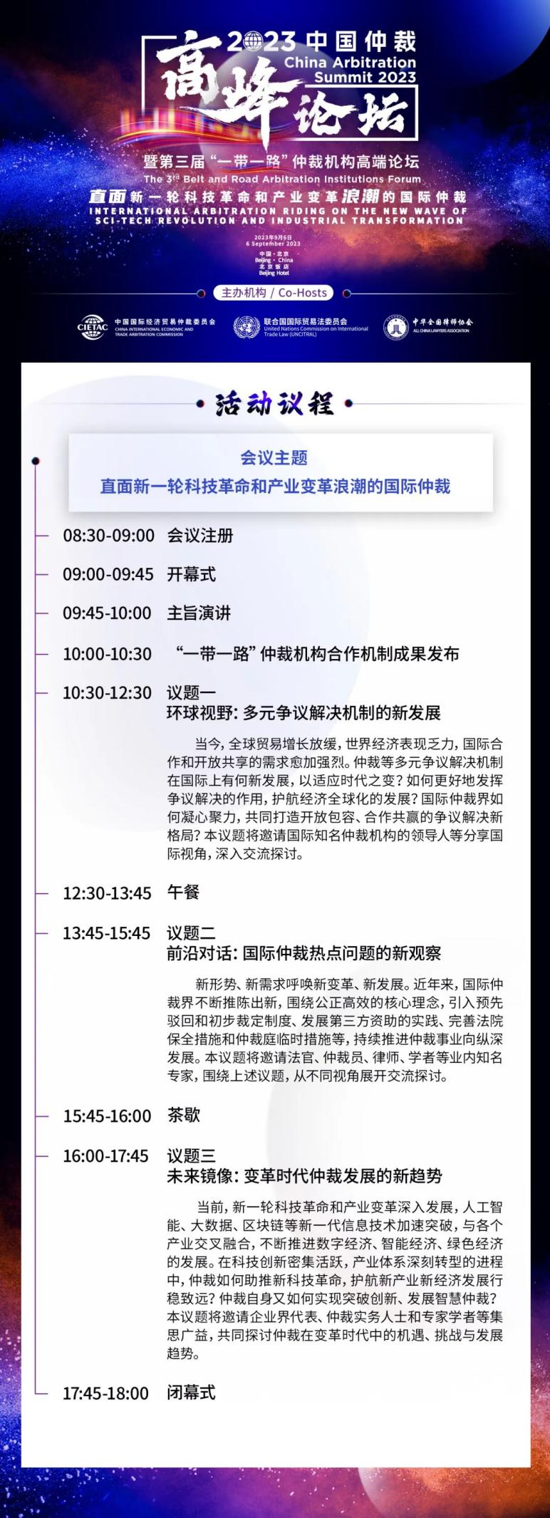 2023中國(guó)仲裁高峰論壇暨第三屆“一帶一路”仲裁機(jī)構(gòu)高端論壇將于2023年9月6日在北京召開(kāi)。作為中國(guó)仲裁周期間最高規(guī)格的盛會(huì),本屆論壇由中國(guó)國(guó)際經(jīng)濟(jì)貿(mào)易仲裁委員會(huì)、聯(lián)合國(guó)國(guó)際貿(mào)易法委員會(huì)以及中華全國(guó)律師協(xié)會(huì)等機(jī)構(gòu)聯(lián)合主辦,并獲得多家仲裁機(jī)構(gòu)和國(guó)際組織的鼎力支持。