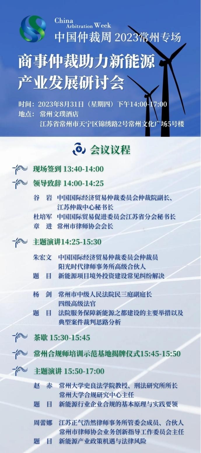 近年來(lái),江蘇省常州市緊扣“國(guó)際化智造名城、長(zhǎng)三角中軸樞紐”的城市定位,在新能源產(chǎn)業(yè)不斷發(fā)力,著力打造引領(lǐng)長(zhǎng)三角,影響全國(guó)乃至全球的“新能源之都”。經(jīng)濟(jì)的蓬勃發(fā)展,產(chǎn)業(yè)的日益興旺,離不開(kāi)良好的營(yíng)商環(huán)境和制度化、規(guī)范化的法律保護(hù)措施。本次“中國(guó)仲裁周”常州專場(chǎng)活動(dòng)——商事仲裁助力新能源產(chǎn)業(yè)發(fā)展研討會(huì),將聚焦新能源產(chǎn)業(yè)熱點(diǎn)問(wèn)題,幫助企業(yè)進(jìn)一步提升化解國(guó)內(nèi)外商事?tīng)?zhēng)議的能力,推動(dòng)建設(shè)公平、高效、法治的市場(chǎng)環(huán)境。