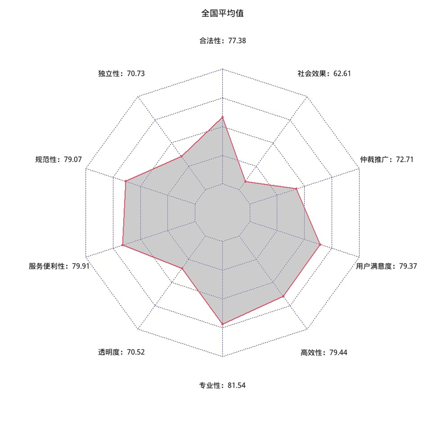 二級指標反映的是仲裁價值的實現(xiàn)程度。從二級指標得分情況來看,得分較高的是服務便利性、高效性和本地用戶滿意度。得分較低的是社會效果和透明度。社會效果指標由兩個比例構成,一是受案標的額與仲裁機構所在地國內(nèi)生產(chǎn)總值的比例,二是仲裁機構受理案件數(shù)量與當?shù)刂屑壢嗣穹ㄔ菏芾砻裆淌掳讣谋壤?。仲裁機構所在地中級人民法院的受案數(shù)量不完整的,以全國仲裁案件占全國民商事訴訟案件的比例為缺失值計算。仲裁受理民商事案件占訴訟案件比例較低,表明仲裁在促進市場經(jīng)濟建設、優(yōu)化營商環(huán)境以及完善社會治理體系方面還具有較大的潛力。
