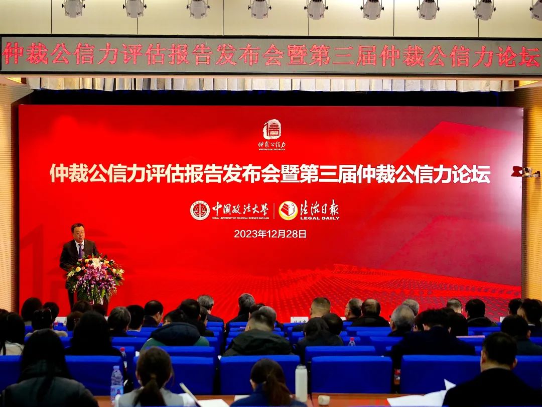 2023年12月28日,仲裁公信力評估報告發(fā)布會暨第三屆仲裁公信力論壇在中國政法大學舉行。全國人大常委會法制工作委員會民法室副主任馬正平,司法部公共法律服務管理局局長楊向斌,最高人民法院法官張梅等國家機關代表蒞臨發(fā)布會。中國政法大學副校長時建中,中國法學會副會長、中國政法大學仲裁研究院理事長黃進,全國人大常委會法制工作委員會民法室原主任賈東明,司法部公共法律服務管理局二級巡視員石海,法制日報社編委、法治網(wǎng)總裁萬學忠以及專家委員會成員出席發(fā)布會。全國多家仲裁機構領導、律師與企業(yè)代表、高??蒲腥藛T以及媒體代表參會。