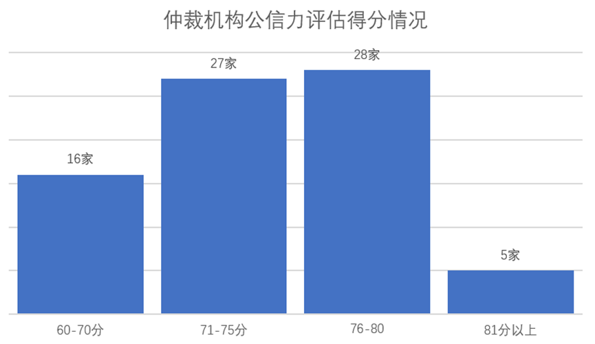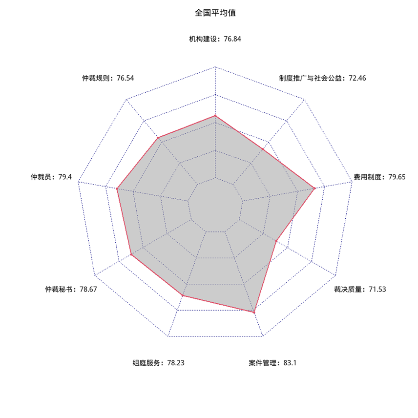 從一級指標得分情況來看,受調(diào)研仲裁機構表現(xiàn)較好的指標是案件管理。該指標主要依據(jù)是仲裁用戶的主觀滿意度評價。這表明機構所在地的當事人對本地機構的評價較高。我國仲裁發(fā)展不平衡,仲裁資源本地化程度較高,滿意度指標橫向可比性較低。該指標主要反映機構所在地當事人對該仲裁機構的看法。一級指標中得分最低的是仲裁裁決,僅為71.5分。仲裁裁決指標的評估標準主要是當事人向法院申請撤銷仲裁裁決與仲裁機構受案數(shù)量比、法院實際撤裁與當事人申請撤裁案件數(shù)量比以及法院實際撤裁案件與仲裁機構受理案件數(shù)量比。該項指標評估依據(jù)來源權威,效度較高,可以部分反映仲裁公信力建設的實際情況。