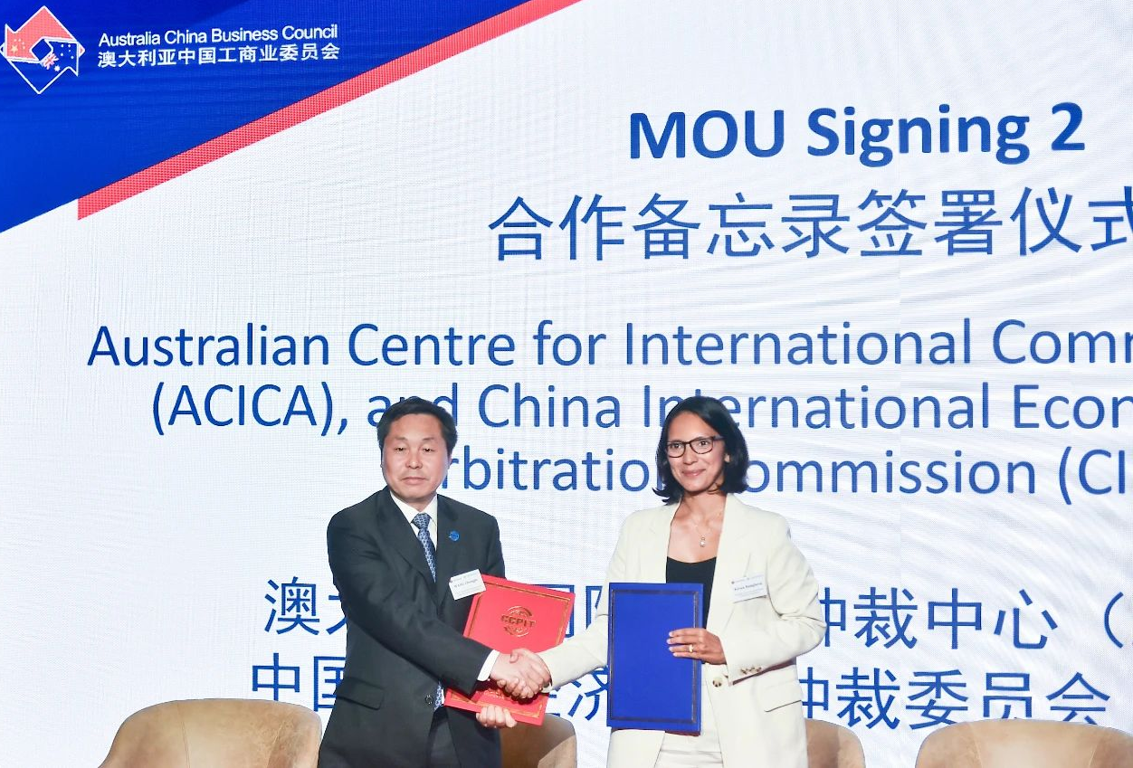 2024年4月15日,在中國貿(mào)促會會長任鴻斌率中國企業(yè)家代表團(tuán)訪問澳大利亞期間,由中國貿(mào)促會和澳中工商業(yè)委員會共同主辦的中國-澳大利亞商務(wù)研討會在澳大利亞悉尼舉行。中國國際經(jīng)濟(jì)貿(mào)易仲裁委員會(以下簡稱“貿(mào)仲”)副主任兼秘書長王承杰與澳大利亞國際商事仲裁中心主席喬治婭·奎克(Georgia Quick)在悉尼簽訂了合作協(xié)議。