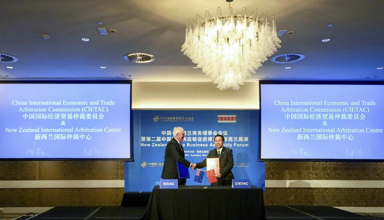 2024年4月19日,在中國貿(mào)促會會長任鴻斌率中國企業(yè)家代表團訪問新西蘭期間,中國國際經(jīng)濟貿(mào)易仲裁委員會(以下簡稱“貿(mào)仲”)副主任兼秘書長王承杰與新西蘭國際仲裁中心主任約翰·格林(John Green),在奧克蘭于中國—新西蘭商務(wù)理事會會議上簽署了合作協(xié)議。中國貿(mào)促會會長任鴻斌、新西蘭中國貿(mào)易協(xié)會主席約翰·考克倫(John Cochrane)、中國駐新西蘭大使王小龍、駐奧克蘭總領(lǐng)事陳世杰等出席簽約儀式。