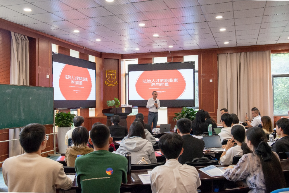 原美的集團全球法務(wù)總監(jiān)、貿(mào)仲仲裁員陳敏作專題演講。陳敏談到,法治人才的職業(yè)素養(yǎng)并不是一種知識,而是一種訓(xùn)練,法學(xué)院的學(xué)生應(yīng)當(dāng)具備的職業(yè)素養(yǎng)包括樹立證據(jù)意識、做事留痕、具備批判思維和審慎品質(zhì)等。法治人才的難得在于不但需要有扎實的法律知識,還需要具備更多其他行業(yè)的基礎(chǔ)知識,必須有意識地突破自己的職業(yè)局限,多方面培養(yǎng)自己的知識體系。他還以網(wǎng)絡(luò)熱詞為例,談?wù)摿四壳暗纳鐣蜆I(yè)情況及學(xué)子們進入職場后可能會遇到的問題,并給出了解決方式和建議。最后,他以“主動權(quán),決定生存權(quán)”作為結(jié)束語,呼吁學(xué)子們厚積薄發(fā),主動把握未來。