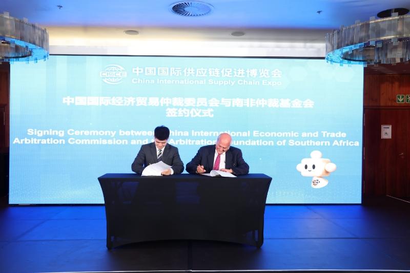 2月20日,在中國-南非經(jīng)貿(mào)論壇暨第三屆鏈博會推介會上,中國國際經(jīng)濟貿(mào)易仲裁委員會(簡稱貿(mào)仲)與南非仲裁基金會簽署合作協(xié)議,并在中國貿(mào)促會會長任鴻斌、中國駐南非使館公使李志剛、南非豪登省副省長雅各布·馬馬波羅以及現(xiàn)場來自中非多國和地區(qū)的政府機構(gòu)、工商界法律界代表200余人的共同見證下,舉辦了簽約儀式。