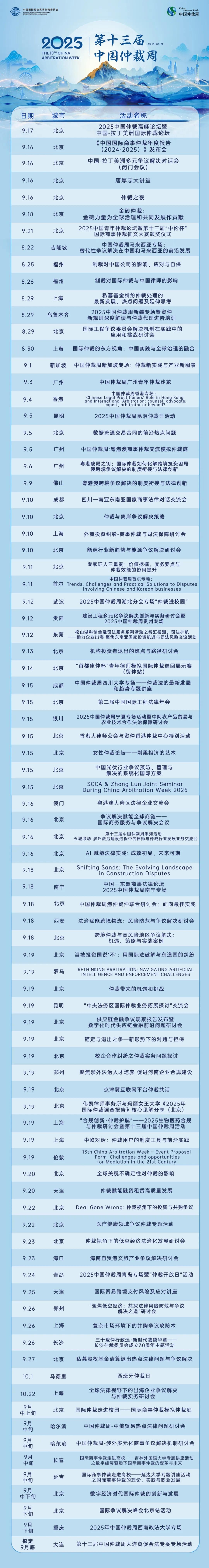 2025年中國仲裁周32城85場活動推告如下: