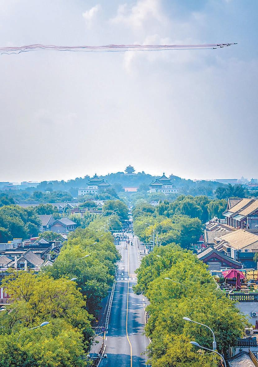 戰(zhàn)機(jī)編隊(duì)拉出的彩煙與中軸線上的古都風(fēng)貌交相輝映。趙瑞 攝