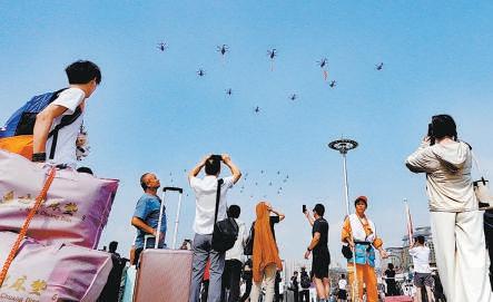 北京站前廣場(chǎng)旅客駐足觀看直升機(jī)梯隊(duì)。記者 安旭東 攝