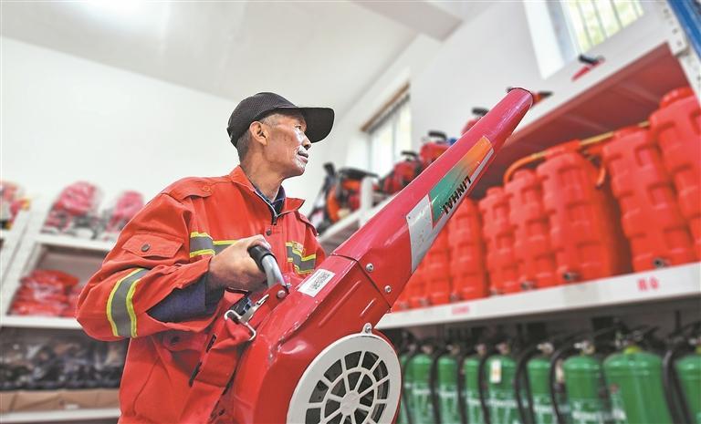 守護(hù)這片綠,防火是全年不能松的“弦”。園區(qū)的防火通道旁,紅色的滅火器箱沿路邊排放整齊。在森林防火物資儲備庫里,管護(hù)員趙金財一邊對設(shè)備進(jìn)行維護(hù),一邊說道:“林子密了,一點火星都可能出大事。一到干燥季節(jié),我們每天要繞著園區(qū)走好幾圈,見著游客抽煙就上前宣教,遇到枯枝落葉也及時清走。這些樹長了十幾年才這么粗,我們多上點心,才能守住這片綠?!?/p>