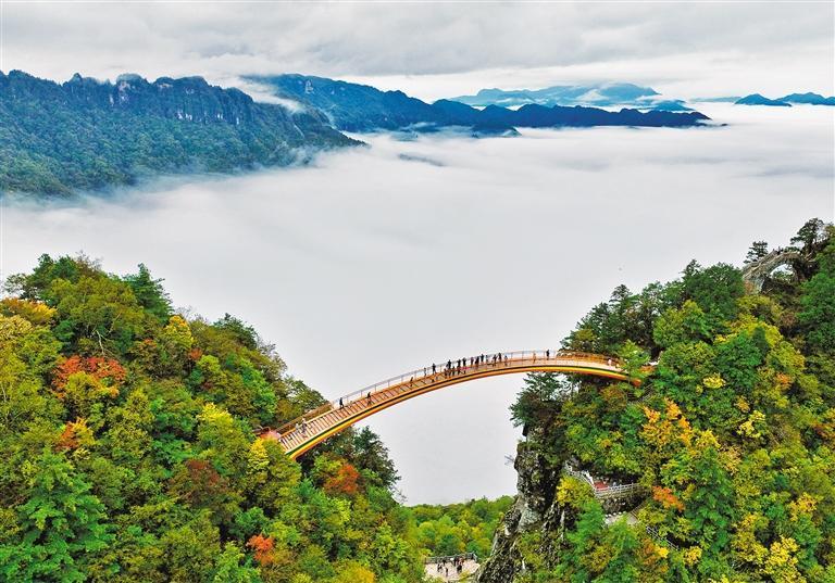 10月3日,位于湖北省西北部的神農(nóng)架天燕景區(qū)云海翻涌。云海是神農(nóng)架景區(qū)秋季最具代表性的自然景觀。 李 瀟攝(中經(jīng)視覺(jué))