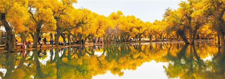 10月10日,游客在內(nèi)蒙古額濟(jì)納旗大漠胡楊林景區(qū)游玩。額濟(jì)納旗境內(nèi)現(xiàn)有天然胡楊林約44萬(wàn)畝,是世界僅存的三大胡楊林之一。 王穩(wěn)鎖攝(中經(jīng)視覺(jué))