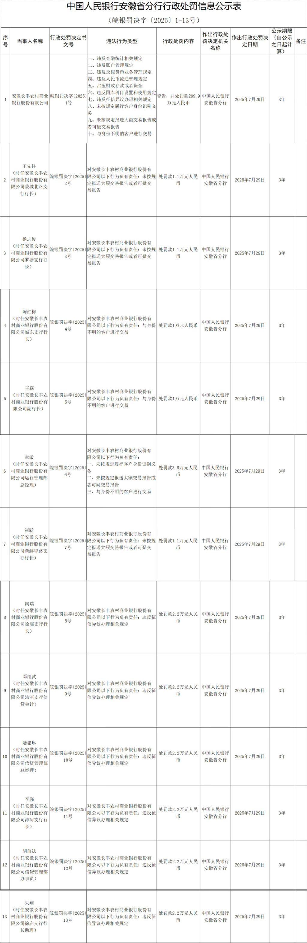 具體看,時(shí)任長豐農(nóng)商行蒙城北路支行行長王先祥、時(shí)任長豐農(nóng)商行羅塘支行行長楊志俊、時(shí)任長豐農(nóng)商行新蚌埠路支行行長崔躍被處罰款1.1萬元,對長豐農(nóng)商行未按規(guī)定報(bào)送大額交易報(bào)告或者可疑交易報(bào)告負(fù)有責(zé)任;