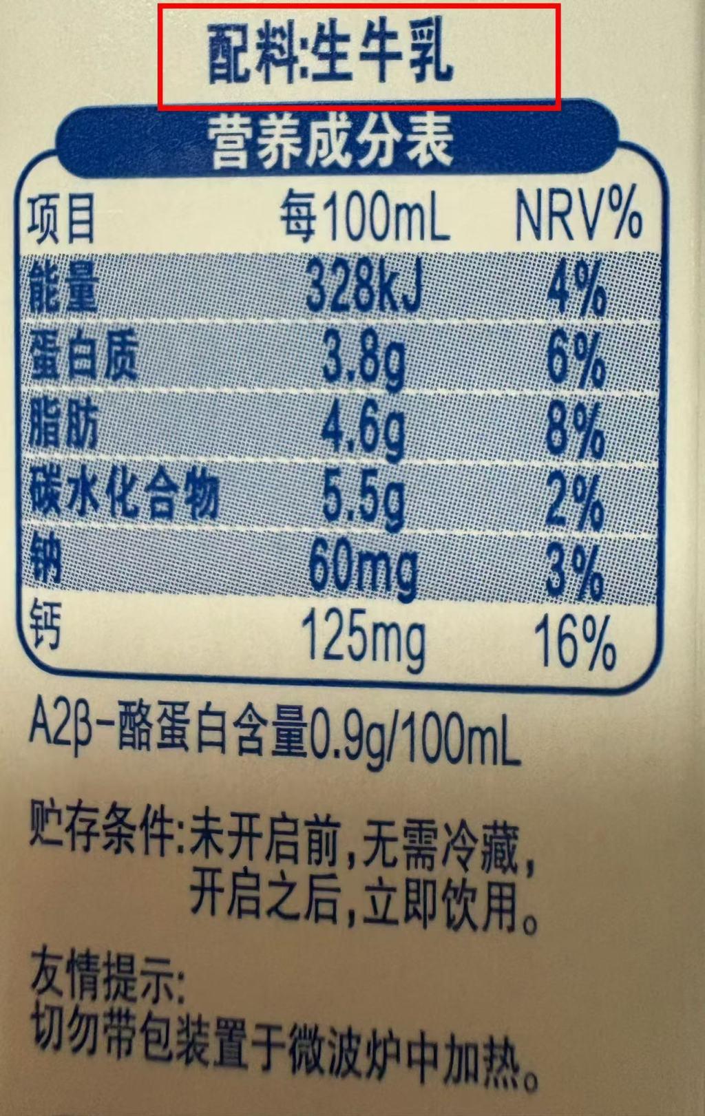 某乳企常溫純牛奶配料表