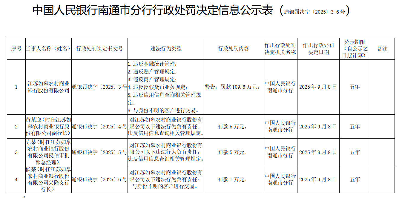 9月16日,中國人民銀行江蘇省分行網(wǎng)站發(fā)布的一則行政處罰信息顯示,江蘇如皋農(nóng)村商業(yè)銀行股份有限公司(以下簡稱“如皋農(nóng)商銀行”)因存在多項業(yè)務違規(guī)行為,被中國人民銀行南通市分行給予警告,并處以109.6萬元罰款。同時,該行3名相關責任人也受到處罰。