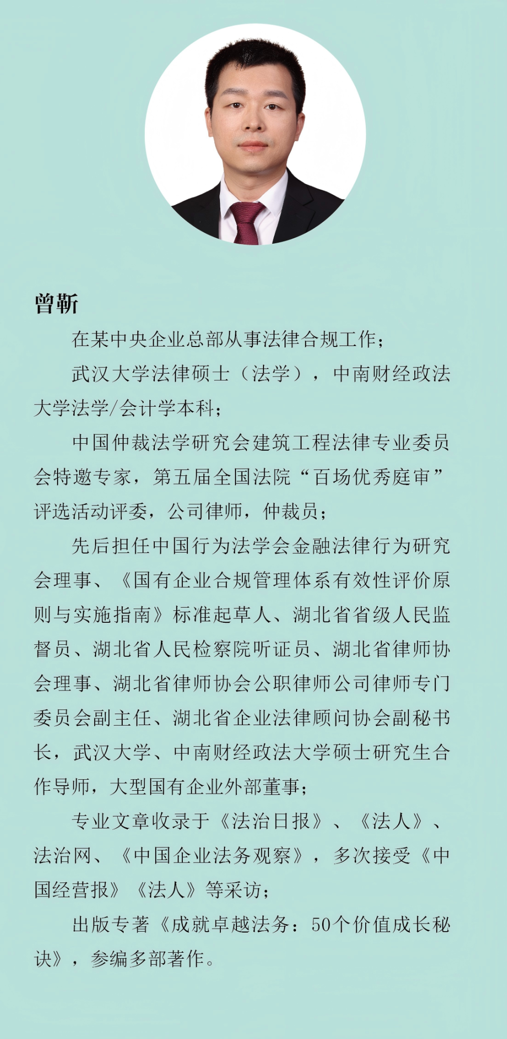 寫(xiě)書(shū)與做學(xué)問(wèn)一樣,都要講社會(huì)責(zé)任。曾靳先后在中南財(cái)經(jīng)政法大學(xué)和武漢大學(xué)法學(xué)院深造,受過(guò)系統(tǒng)良好的法學(xué)方法訓(xùn)練,投身法務(wù)工作后,依然嚴(yán)格地將公正、嚴(yán)謹(jǐn)、批判和理性等要素內(nèi)嵌于法律思維中,讓這份對(duì)法律的熱愛(ài)和忠忱幽然生花,熠熠生輝。于此,我欣喜地看見(jiàn)本書(shū)的誕生,關(guān)注著他的不斷成長(zhǎng),希望他繼續(xù)心懷使命、筆耕不輟,為構(gòu)建法律職業(yè)共同體承擔(dān)屬于自己的那份責(zé)任。