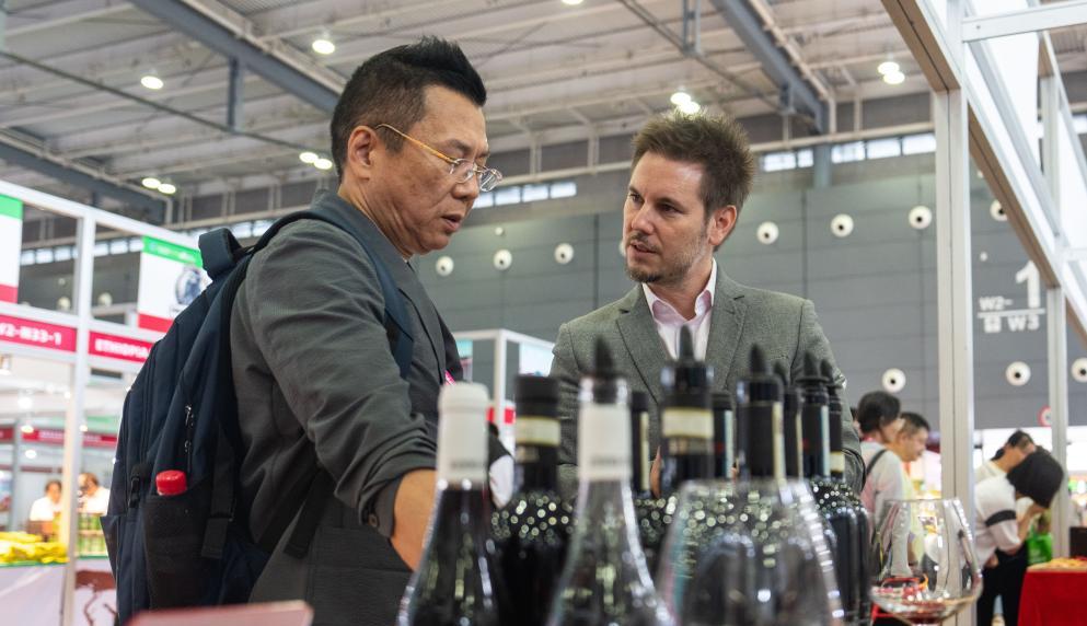 9月19日,在長沙國際會(huì)展中心,參展商(右)在介紹展出的紅酒。新華社記者 陳思汗 攝