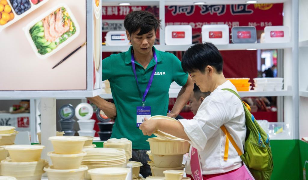 9月19日,在長沙國際會(huì)展中心,觀眾(右)在了解一次性飯盒。新華社記者 陳思汗 攝