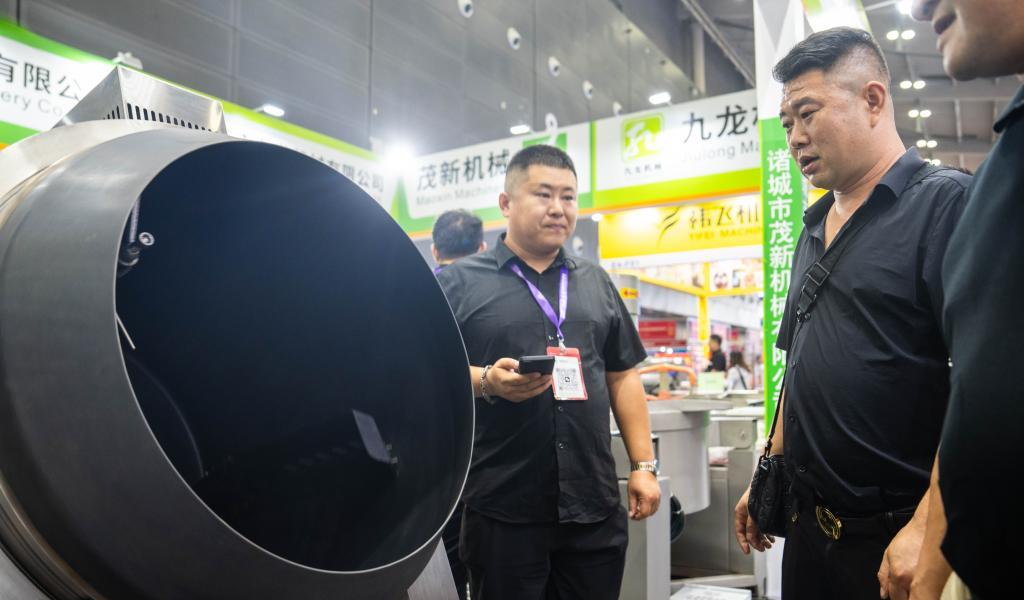 9月19日,在長沙國際會(huì)展中心,觀眾(右)在了解商用炒菜設(shè)備。新華社記者 陳思汗 攝