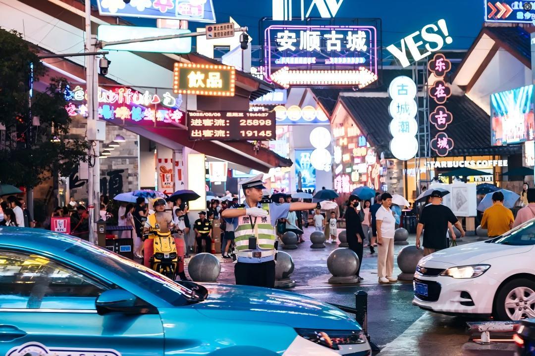 如果說景區(qū)交通管理是安順交警的常規(guī)動(dòng)作,那么中心城區(qū)面臨的挑戰(zhàn)則是全新的“考題”。隨著“21℃的城市·360度的人生”城市IP品牌的打響,以安順古城、虹山湖休閑生活區(qū)為首的城區(qū)景點(diǎn)和大街小巷遍布的特色小吃,讓許多游客從“過境游”向“深度游”、從“景點(diǎn)打卡”向“避暑度假”轉(zhuǎn)變,許多游客整個(gè)暑期都在安順度過,感受迷人風(fēng)光、深厚底蘊(yùn)與夏日清涼的獨(dú)特魅力。今年7月起,安順古城單日平均接待游客10萬人次,最高峰達(dá)到18萬人次,這展示了安順一流旅游城市建設(shè)的成果,但是在道路資源變化不大的情況下,群眾日常出行疊加游客自駕出行需求,讓城市交通流量大幅增加,給道路交通管理帶來了極大挑戰(zhàn)。