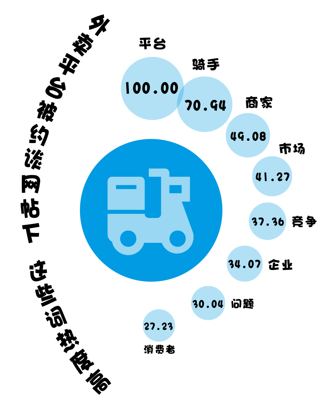 (數(shù)據(jù)來源:選取知乎話題“市場監(jiān)管總局等五部門約談京東、美團(tuán)、餓了么等外賣平臺(tái)企業(yè),釋放了什么信號?”下的659個(gè)回答,做分詞及歸一化處理,進(jìn)行分詞后將熱度最高的詞語規(guī)定為100)