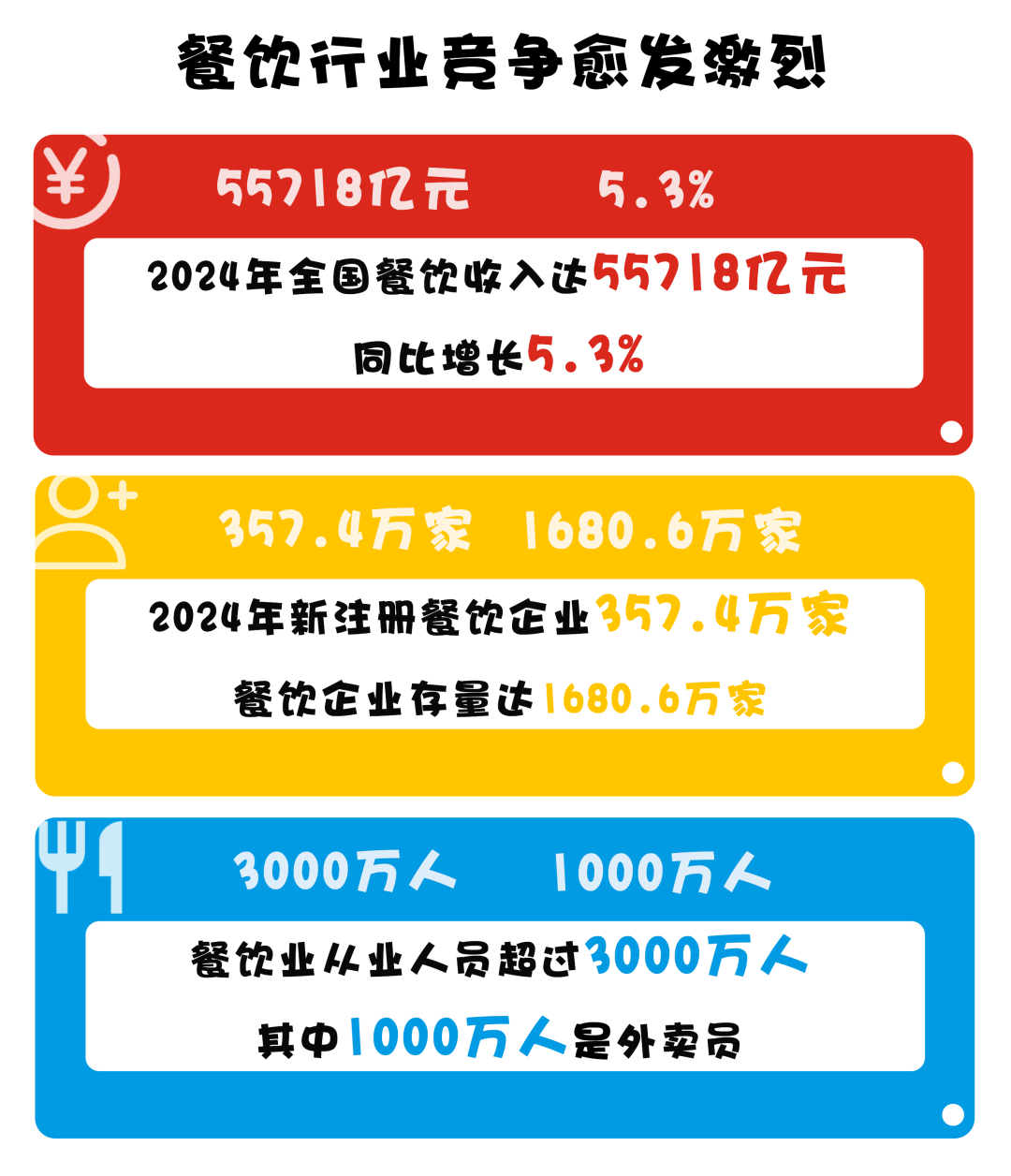 餐飲行業(yè)競爭激烈。數(shù)據(jù)顯示,截至2024年,我國餐飲企業(yè)數(shù)量已突破1680萬家,餐飲業(yè)從業(yè)人員超3000萬人,其中超1000萬人為外賣員。在此背景下,與外賣平臺(tái)合作成為不少商家順應(yīng)時(shí)代、立足行業(yè)的重要選擇。