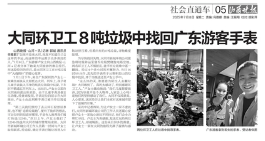 《山西晚報》對大同環(huán)衛(wèi)工翻垃圾幫游客找手表事件的報道