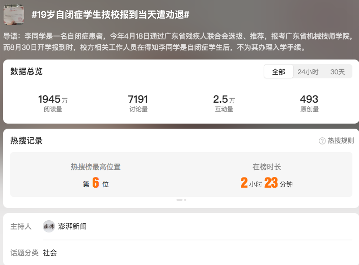 9月9日,澎湃新聞采訪相關(guān)方首發(fā)報(bào)道,當(dāng)事同學(xué)父親認(rèn)為,校方的審核、錄取程序存在諸多疏漏,直至入學(xué)報(bào)到當(dāng)天才說(shuō)不予接收,讓學(xué)生錯(cuò)失了報(bào)讀其他學(xué)校的機(jī)會(huì)。廣東省機(jī)械技師學(xué)院宣傳部相關(guān)負(fù)責(zé)人回應(yīng)稱,學(xué)校確實(shí)向該同學(xué)發(fā)放錄取通知書,但該殘疾人招生項(xiàng)目主要面向肢體殘疾和言語(yǔ)殘疾學(xué)生,面試時(shí)校方教師對(duì)該同學(xué)患有自閉癥并不知情。因擔(dān)心對(duì)學(xué)校正常學(xué)生造成影響,建議其找其他合適的學(xué)校就讀。該報(bào)道發(fā)布后,齊魯晚報(bào)、上游新聞、極目新聞等媒體跟進(jìn)轉(zhuǎn)載,輿情開(kāi)始發(fā)酵,#19歲自閉癥學(xué)生技校報(bào)到當(dāng)天遭勸退#微博話題登上熱搜榜第6位。
