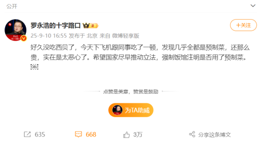 回溯這場(chǎng)討論的源頭,始于羅永浩的一篇微博。9月10日下午,“@羅永浩的十字路口”發(fā)博稱,“好久沒吃西貝了,今天下飛機(jī)跟同事吃了一頓發(fā)現(xiàn)幾乎全都是預(yù)制菜,還那么貴,實(shí)在是太惡心了。希望國家盡早推動(dòng)立法,強(qiáng)制飯館注明是否用了預(yù)制菜?!碧陌l(fā)出后迅速引起網(wǎng)民關(guān)注。