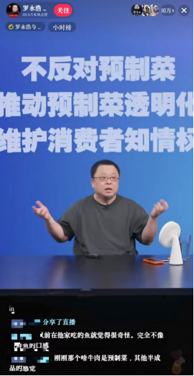 9月12日晚間,羅永浩在多平臺(tái)同步直播,開播僅10分鐘其抖音直播間觀看人數(shù)已超10萬。羅永浩在直播中以西貝使用的“凍海鱸魚”舉例,認(rèn)為食用這種經(jīng)過深度工業(yè)化處理的食材與大眾去餐廳追求新鮮的初衷顯然不符,且稱西貝“是所有賣預(yù)制菜餐廳里賣最貴的”。羅永浩強(qiáng)調(diào),預(yù)制菜還沒有正式的國家標(biāo)準(zhǔn),不反對(duì)預(yù)制菜,而是主張“推動(dòng)中國預(yù)制菜行業(yè)透明化、保障消費(fèi)者的知情權(quán)”,并點(diǎn)贊了餐飲品牌老鄉(xiāng)雞公示菜品區(qū)分“現(xiàn)做”“半預(yù)制”“預(yù)制”加工等級(jí)的舉措。