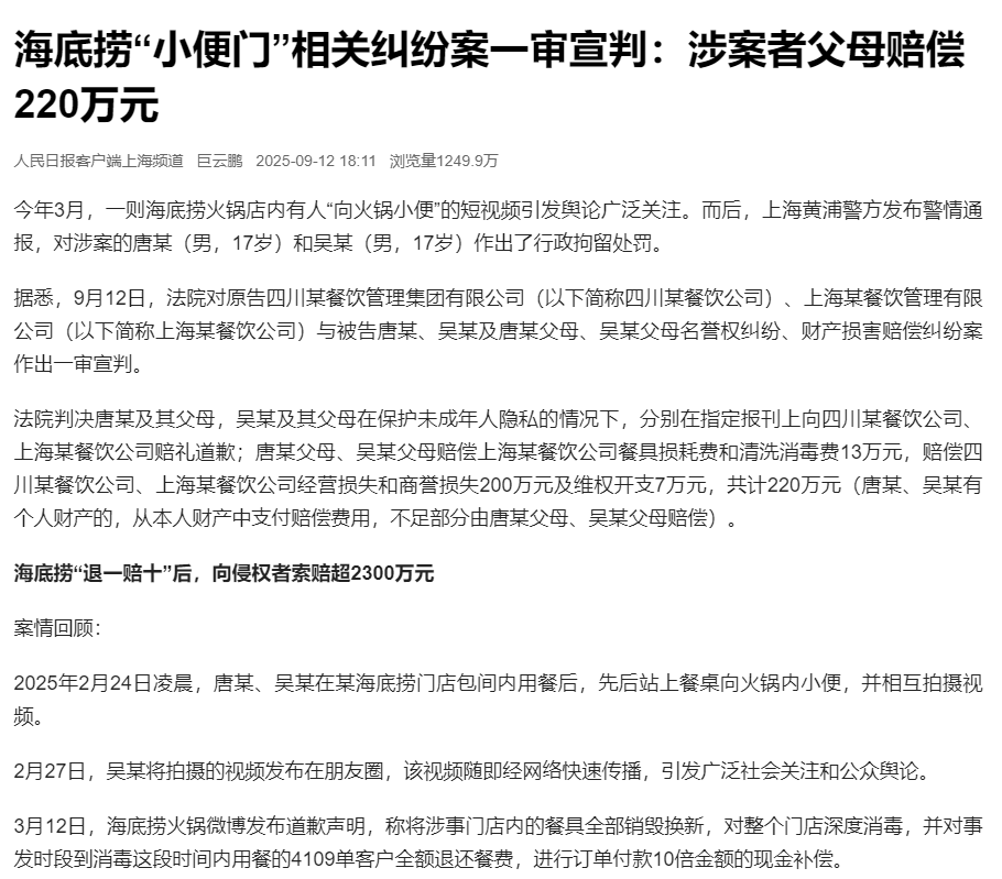 (海底撈“小便門”相關(guān)糾紛案一審判決結(jié)果 來源:人民日報客戶端)
