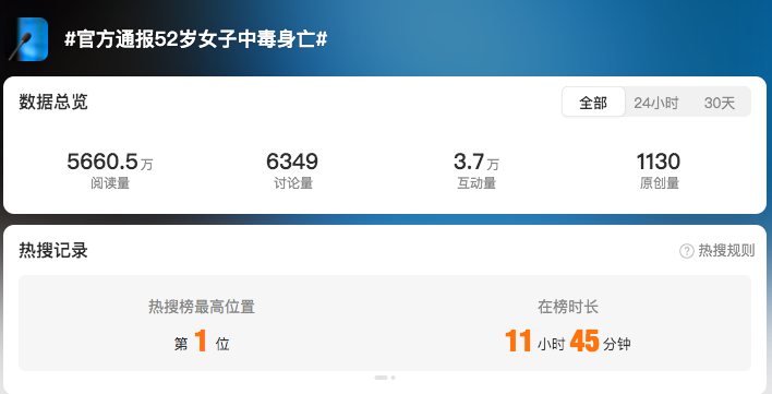 9月15日,浙江省杭州市余杭區(qū)閑林街道辦事處發(fā)布情況通報稱,9月9日,涂某某(女,52歲)在進(jìn)入閑林中路附近空地時,不慎接觸廢棄氫氟酸中毒,送醫(yī)后經(jīng)搶救無效于2025年9月14日凌晨不幸身亡。公安機(jī)關(guān)在接警后第一時間介入調(diào)查;生態(tài)環(huán)境部門已按規(guī)范完成現(xiàn)場無害化處置;街道正在全力推進(jìn)善后處置工作。目前,事發(fā)原因正在進(jìn)一步調(diào)查中。當(dāng)晚“官方通報52歲女子中毒身亡”登上熱搜榜第一位,閱讀量迅速破千萬。