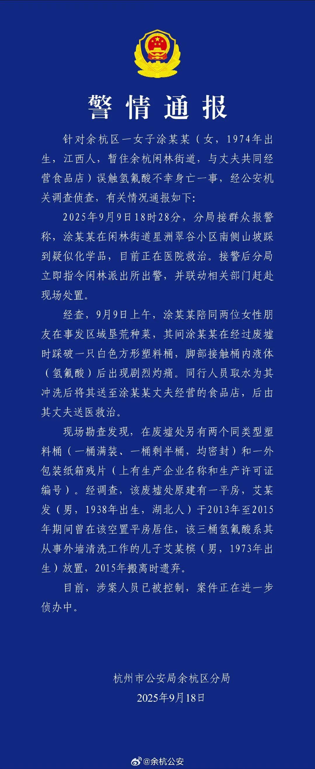 9月18日16時(shí)許,“@余杭公安”官方微博發(fā)布警情通報(bào)。經(jīng)查,9月9日上午,涂某某陪同兩位女性朋友在事發(fā)區(qū)域墾荒種菜,其間涂某某在經(jīng)過(guò)廢墟時(shí)踩破一只白色方形塑料桶,腳部接觸桶內(nèi)液體(氫氟酸)后出現(xiàn)劇烈灼痛。同行人員取水為其沖洗后將其送至涂某某丈夫經(jīng)營(yíng)的食品店,后由其丈夫送醫(yī)救治?,F(xiàn)場(chǎng)勘查發(fā)現(xiàn),在廢墟處另有兩個(gè)同類型塑料桶(一桶滿裝、一桶剩半桶,均密封)和一外包裝紙箱殘片(上有生產(chǎn)企業(yè)名稱和生產(chǎn)許可證編號(hào))。經(jīng)調(diào)查,該廢墟處原建有一平房,艾某發(fā)(男,1938年出生,湖北人)于2013年至2015年期間曾在該空置平房居住,該三桶氫氟酸系其從事外墻清洗工作的兒子艾某檳(男,1973年出生)放置,2015年搬離時(shí)遺棄。目前,涉案人員已被控制,案件正在進(jìn)一步偵辦中。