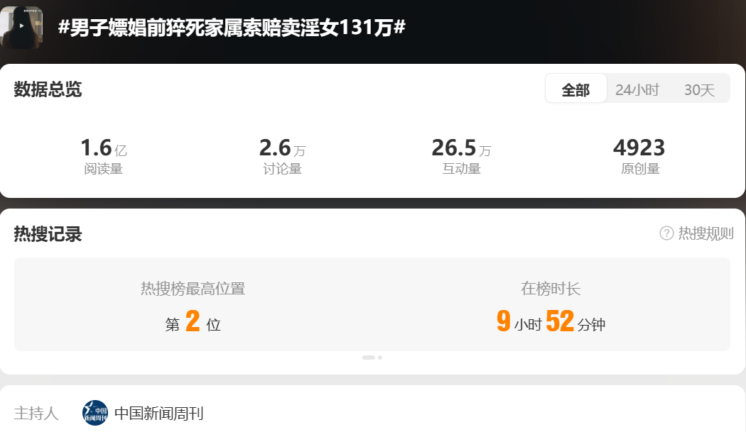 此案被報(bào)道后,“@中國新聞周刊”、上觀新聞、封面新聞等媒體接力傳播,推高輿情熱度,微博話題“#男子嫖娼前猝死家屬索賠賣淫女131萬#”登上熱搜榜第2位。