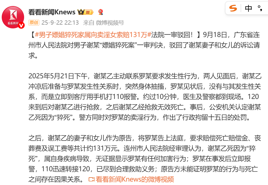 9月22日,據(jù)上海電視臺(tái)“@看看新聞Knews”消息,9月18日,廣東省連州市人民法院對(duì)男子謝某“嫖娼猝死案”作出一審判決。裁判文書網(wǎng)顯示,5月21日,謝某主動(dòng)聯(lián)系羅某要求發(fā)生性行為,兩人見面后,謝某沖涼后準(zhǔn)備發(fā)生性關(guān)系時(shí)突然身體抽搐,羅某見狀后,立即到客廳撥打110報(bào)警。醫(yī)護(hù)人員趕到后對(duì)謝某進(jìn)行搶救,謝某經(jīng)搶救無效死亡。警方認(rèn)定謝某死因?yàn)椤扳馈保瑢?duì)羅某的賣淫行為,作出行政拘留十五日的處罰。事后,謝某的妻子和女兒將羅某告上法庭,要求賠償死亡賠償金、喪葬費(fèi)及誤工費(fèi)等共計(jì)約131萬元。連州市人民法院經(jīng)審理認(rèn)為,謝某死因?yàn)椤扳馈?,屬自身疾病?dǎo)致,無證據(jù)顯示羅某有任何加害行為;羅某在事發(fā)后當(dāng)即報(bào)警并配合120搶救,已盡到合理救助義務(wù);原告方未能證明羅某的行為與死亡之間存在因果關(guān)系。據(jù)此,該法院駁回謝某妻子和女兒的全部訴訟請(qǐng)求。