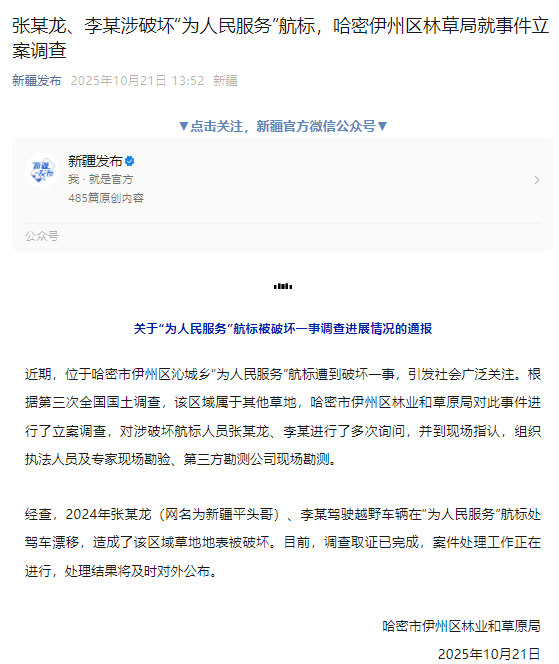 10月21日,新疆維吾爾自治區(qū)新聞辦公室官方微信號(hào)“新疆發(fā)布”發(fā)布通報(bào),稱哈密市伊州區(qū)林業(yè)和草原局對(duì)此事件進(jìn)行了立案調(diào)查,對(duì)涉破壞航標(biāo)人員張某龍(網(wǎng)名為“新疆平頭哥”)、李某進(jìn)行了多次詢問(wèn),并到現(xiàn)場(chǎng)指認(rèn)處理結(jié)果將及時(shí)對(duì)外公布。人民日?qǐng)?bào)、澎湃新聞、紅星新聞等轉(zhuǎn)發(fā)了通報(bào)內(nèi)容,輿情有所回溫。