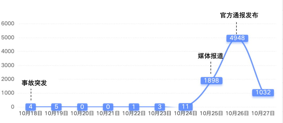 自10月18日起,少量網(wǎng)民發(fā)布事故信息引發(fā)關注,25日媒體介入報道推動輿情熱度快速攀升,官方發(fā)布通報后輿情信息量達觸頂峰。截至10月28日10時,相關信息8061條,相關微博話題閱讀量累計達1.15億。