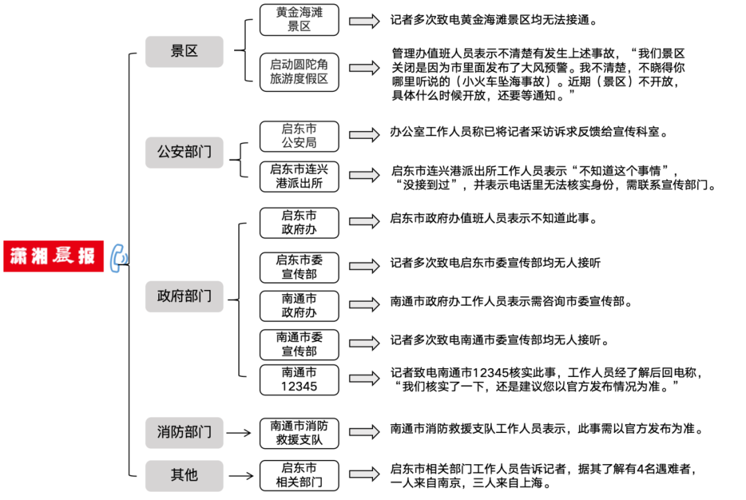 10月25日13時許,瀟湘晨報報道稱,江蘇一海灘景區(qū)觀光小火車疑發(fā)生事故致多人傷亡。記者向景區(qū)及市縣十余個部門致電,但回應均為“不清楚”“不知道此事”“等官方發(fā)布通知”“聯(lián)系宣傳部門”(回復情況見下圖)。啟東市相關部門工作人員表示,據(jù)其了解有4名遇難者,一人來自南京,三人來自上海。