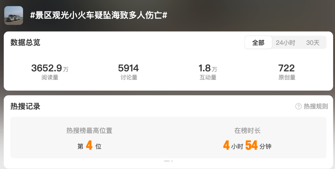 10月18日起,有網(wǎng)民通過微博、小紅書爆料稱,江蘇南通啟東市黃金海灘景區(qū)附近發(fā)生一起觀光小火車墜海事故,有人遇難。10月18日17時51分,微信公眾號“江蘇黃金海灘景區(qū)”發(fā)布公告稱,黃金海灘景區(qū)臨時閉園,開園時間另行通知。10月24日,南通市自媒體“江海通報”發(fā)文稱,“數(shù)日前江蘇一地小火車墜海致多人死亡,當?shù)厥锌h兩級政府及文旅部門尚未發(fā)布通報或辟謠,網(wǎng)絡平臺出現(xiàn)‘啟東小火車墜?!畣|小火車翻車’等相關搜索熱詞,但一直搜索不到任何對應結果。”有關該事故的信息零散出現(xiàn),部分網(wǎng)民追問事故發(fā)生的具體時間及傷亡人數(shù)。