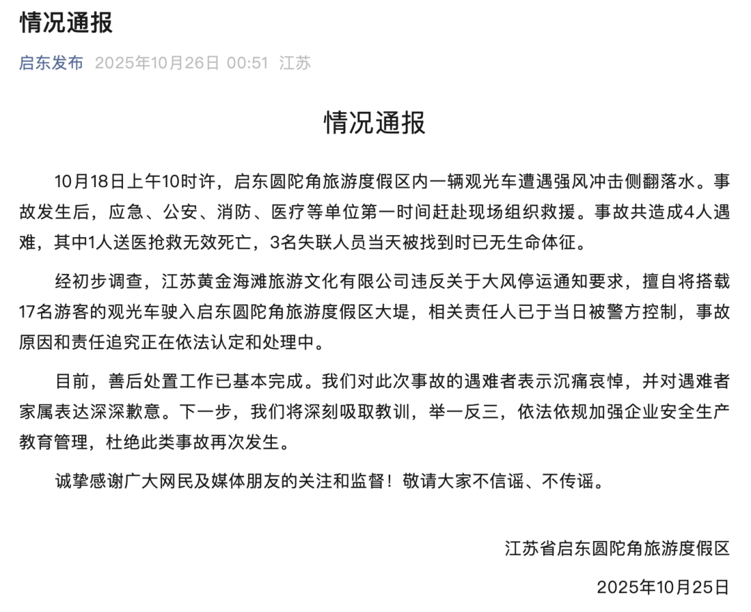 10月26日凌晨,啟東市委宣傳部官方公眾號“啟東發(fā)布”通報稱:10月18日上午10時許,啟東圓陀角旅游度假區(qū)內(nèi)一輛觀光車遭遇強風沖擊側翻落水。事故發(fā)生后,應急、公安、消防、醫(yī)療等單位第一時間趕赴現(xiàn)場組織救援。事故共造成4人遇難,其中1人送醫(yī)搶救無效死亡,3名失聯(lián)人員當天被找到時已無生命體征。經(jīng)初步調(diào)查,江蘇黃金海灘旅游文化有限公司違反關于大風停運通知要求,擅自將搭載17名游客的觀光車駛入啟東圓陀角旅游度假區(qū)大堤,相關責任人已于當日被警方控制,事故原因和責任追究正在依法認定和處理中。目前,善后處置工作已基本完成。
