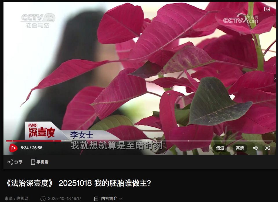10月18日,央視社會(huì)與法頻道《法治深壹度》節(jié)目播發(fā)專題報(bào)道《我的胚胎誰做主?》,報(bào)道一起喪偶婦女輔助生殖權(quán)益案。據(jù)介紹,福建李女士在丈夫不幸去世后,希望利用夫妻二人在醫(yī)院冷凍保存的胚胎繼續(xù)實(shí)施移植手術(shù),但醫(yī)院鑒于醫(yī)學(xué)倫理問題拒絕了她的請(qǐng)求。隨后李女士將醫(yī)院起訴至法院,一審和二審均被駁回。直至2022年6月,福建省高級(jí)人民法院再審認(rèn)為,李女士要求醫(yī)院為其實(shí)施胚胎移植手術(shù)生育二胎有充分的法律依據(jù),并且還能在精神上撫慰雙方的老人,最終判決醫(yī)院繼續(xù)履行合同,為李女士實(shí)施胚胎移植手術(shù)。該報(bào)道采訪到李女士本人、醫(yī)院代理律師、法學(xué)專家及法官,全面回顧李女士個(gè)人遭遇、情感動(dòng)機(jī)以及案件背后的法理爭(zhēng)議。
