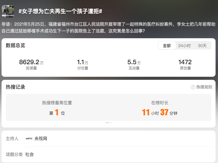 10月28日晚,“@央視網(wǎng)”官方微博發(fā)出26分鐘的報(bào)道視頻,摘取報(bào)道引言內(nèi)容,并設(shè)置“#女子用亡夫胚胎求試管二胎遭拒#”“#女子想為亡夫再生一個(gè)孩子遭拒#”話題,將該案引入輿論視野,引發(fā)網(wǎng)民討論。后續(xù)不斷有“南方都市報(bào)”“新浪新聞”“生活幫”等媒體短視頻賬號(hào)發(fā)布該報(bào)道切片視頻,關(guān)注度隨之升溫。10月29日,微博話題“#女子用亡夫胚胎求試管二胎遭拒#”沖上熱搜榜第1位。