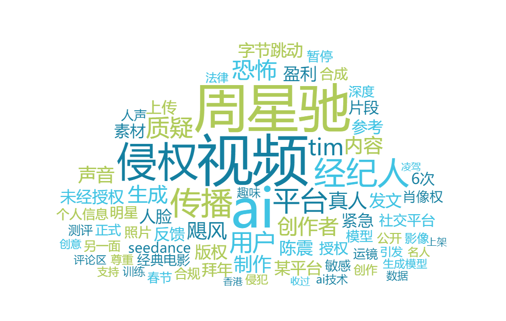 截至2月13日15時,全網(wǎng)相關(guān)信息29338條,“#周星馳經(jīng)紀人問AI周星馳侵權(quán)嗎#”“#周星馳經(jīng)紀人呼吁平臺監(jiān)管AI侵權(quán)#”“#律師稱AI周星馳影像標注AI也侵權(quán)#”“#即夢暫停參考真人素材生成AI視頻#”“#即夢AI團隊回應(yīng)深知創(chuàng)意的邊界是尊重#”“#面對AI肖像侵權(quán)平臺不能做甩手掌柜#”等相關(guān)微博話題累計閱讀量超2356萬。