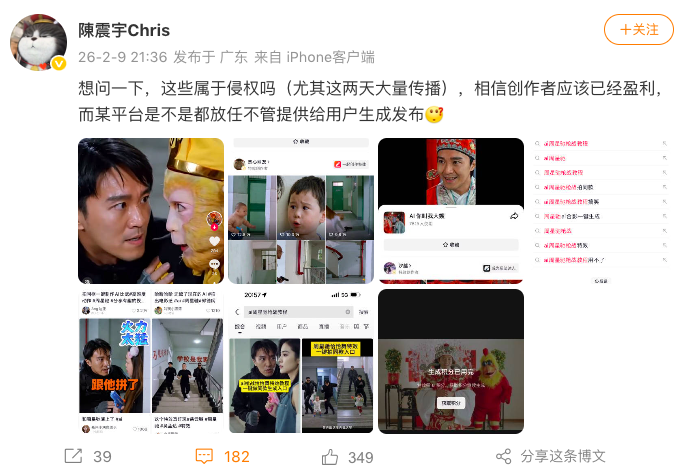 2月9日,周星馳經(jīng)紀人“@陳震宇Chris”發(fā)現(xiàn)近期某短視頻平臺上AI生成的周星馳經(jīng)典電影片段被大量傳播,并在微博上發(fā)問,“這些屬于侵權(quán)嗎?創(chuàng)作者可能已經(jīng)借此盈利,平臺是否放任不管?”相關(guān)言論迅速在網(wǎng)絡(luò)引發(fā)熱議,將“AI魔改”視頻再次推上輿論風(fēng)口浪尖。