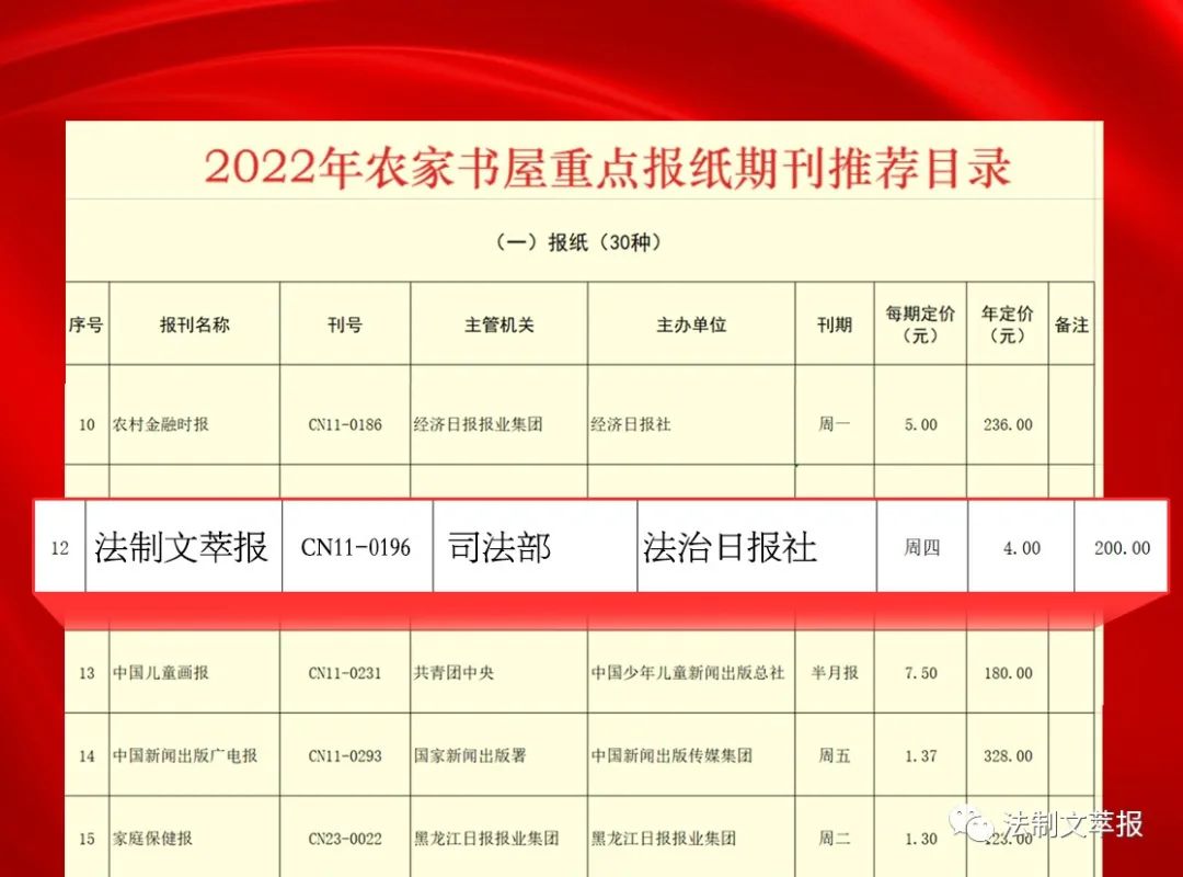 為深入學習宣傳貫徹習近平新時代中國特色社會主義思想,迎接黨的二十大勝利召開,指導各地做好2022年農(nóng)家書屋出版物補充更新工作,國家新聞出版署組織制定了《2022年農(nóng)家書屋重點出版物推薦目錄》。《推薦目錄》分重點圖書、重點報紙期刊、重點音像制品和電子出版物、重點少數(shù)民族文字圖書四類。《法制文萃報》成為重點報紙期刊推薦目錄中唯一一家法治類報紙。