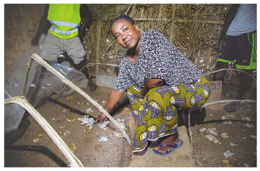 在中非共和國首都班吉附近的大馬拉地區(qū),盛夏7月的午后時分,太陽熱辣,一間約6平方米、四壁用棕櫚葉遮陰的菇棚里卻幽暗清涼。棚內有兩個長2米、寬1米的畦床,其間星羅棋布地點綴著剛萌出的數十簇平菇。40歲的法蒂瑪蹲在土埂上,用手撥弄著飽滿的灰白色菌蓋,臉上難掩豐收的喜悅。