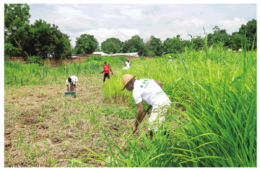 6月1日,在中非共和國首都班吉郊區(qū),當地民眾種植菌草。新華社記者羅毓攝