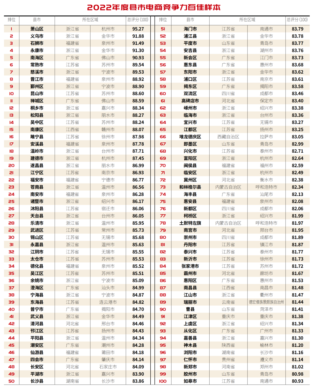 作為數(shù)字經(jīng)濟(jì)的一種形態(tài),縣域電商不僅是人們?cè)鍪罩赂坏闹匾?,也是?qū)動(dòng)地方產(chǎn)業(yè)發(fā)展,甚至盤活整個(gè)縣域經(jīng)濟(jì)的一把利器。2022年5月,“2022年度縣市電商競(jìng)爭力百佳樣本”榜單重磅發(fā)布,浙江省杭州市蕭山區(qū)、浙江省金華市義烏市、福建省泉州市石獅市、浙江省金華市永康市、廣東省佛山市南海區(qū)、江蘇省蘇州市常熟市、浙江省寧波市慈溪市、福建省泉州市晉江市、浙江省寧波市鄞州區(qū)、江蘇省蘇州市昆山市位列前十。