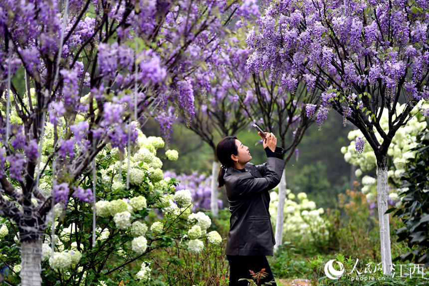 4月6日,江西省上饒市廣豐區(qū)大南鎮(zhèn)新塘的中華木繡球博覽園里游客如織,當(dāng)前,正值木繡球的盛開(kāi)期,白的如雪、綠的如玉,加上紫藤、茶梅的襯托,整個(gè)博覽園顯得清新淡雅,游客們徜徉其中賞花打卡,好不自在。