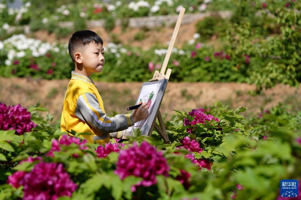 4月16日,小朋友在白臺峪村牡丹農業(yè)產業(yè)園內寫生。記者 駱學峰 攝