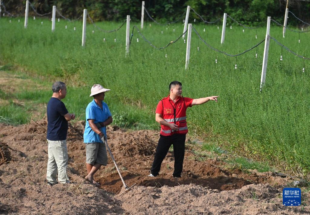 6月14日,窯上村駐村第一書記榮雙全(右一)在蔬菜基地查看發(fā)展情況。記者 黃孝邦 攝